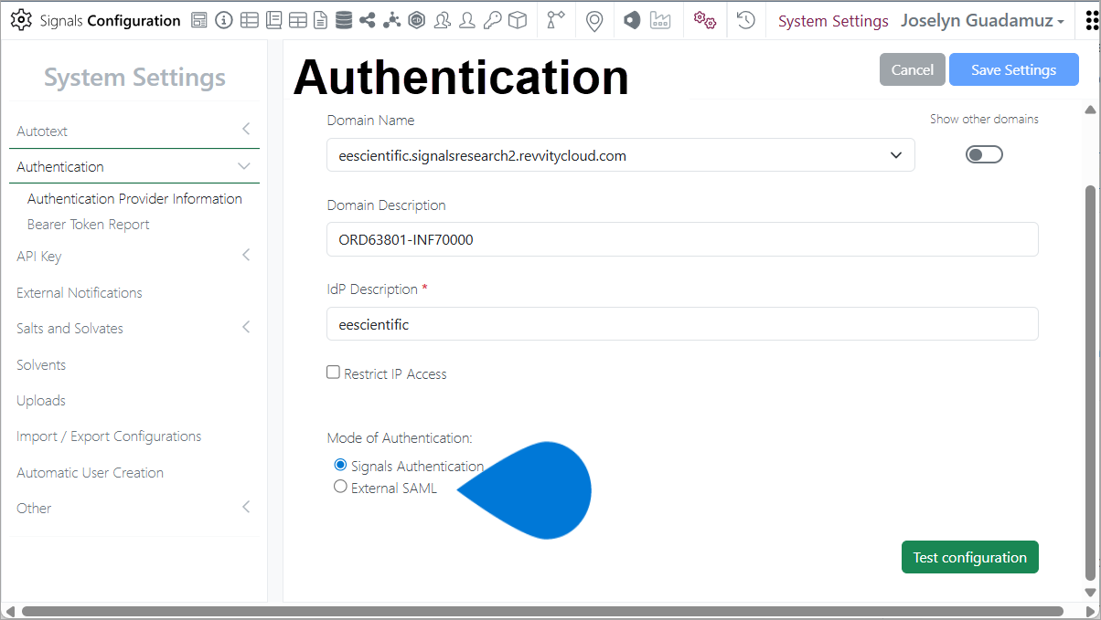 - Signals Notebook SAML Application ID: This can be the domain name. Provide any name for the Signals Notebook application to be sent to IdP.