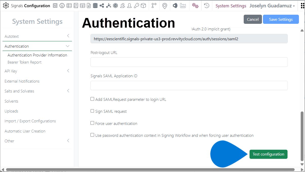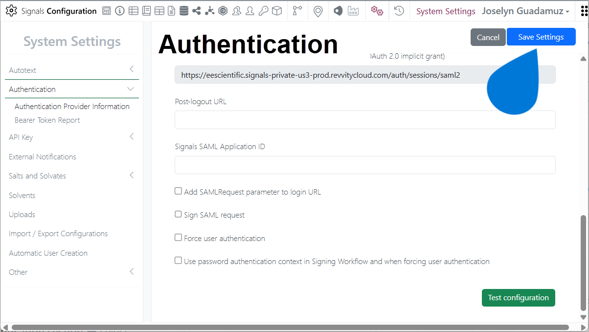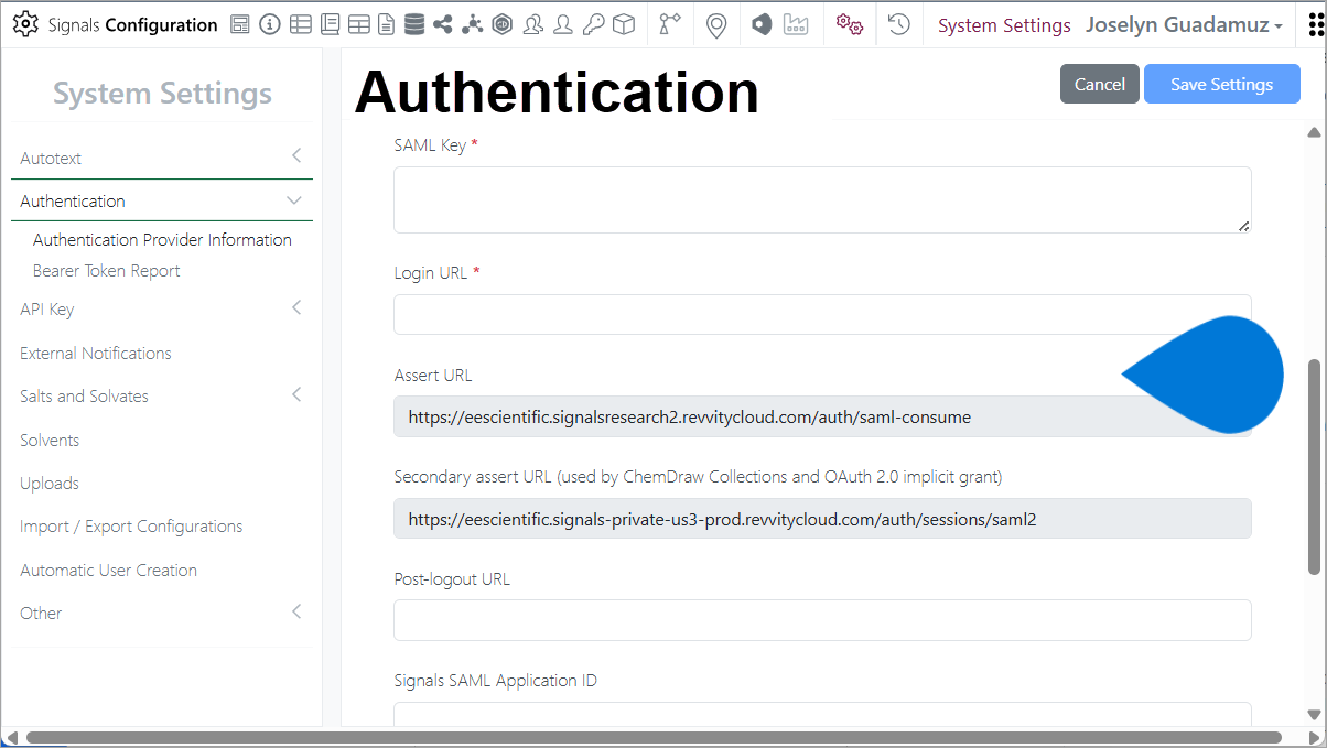 - Post-logout URL: The user is taken here when they log out of Signals Notebook with the SAML Authentication.