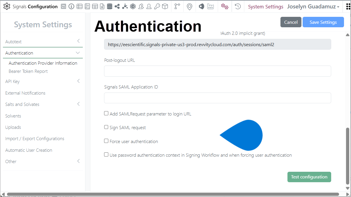 - Force User Authentication: Enabling this parameter makes Signals Notebook send the ForceAuthn SAML attribute set to true in the SAML request.
