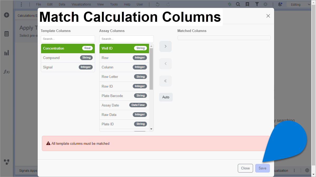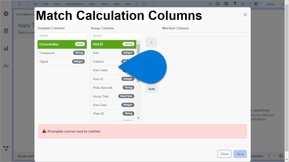 From the Match Calculation Columns window, the user can select the [Auto] button to automatically match the columns.
