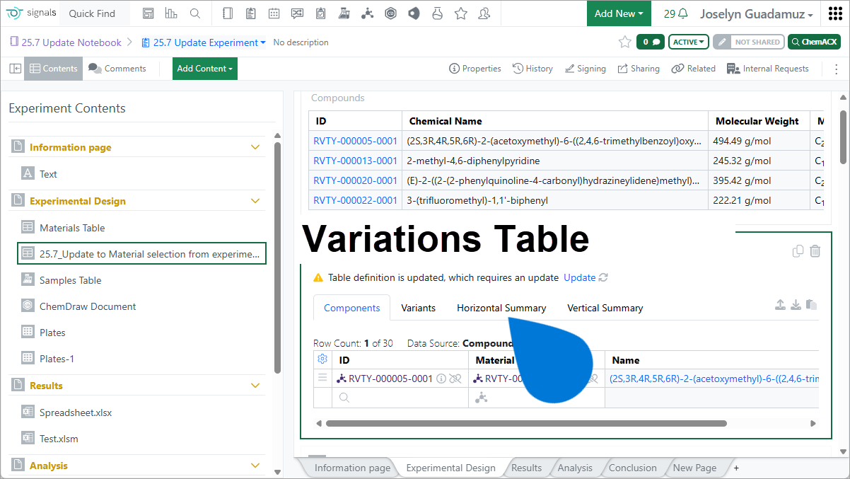 Entering data into a Variations Table in the Horizontal Summary view